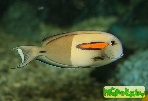 Средних размеров хирург с вытянутым телом и длинными косицами удлиненных крайних лучей хвостового плавника. Окраска очень изменчива, хотя общий тип рисунка сохраняется у различных цветовых морф. Передняя часть тела окрашена заметно светлее задней, но в той же цветовой гамме. Четкая вертикальная граница между этими зонами проходит чуть позади середины туловища. Взрослые особи светло-серые, буроватые или темно-коричневые. Непарные плавники того же цвета, что и соответствующие участки туловища, короткие лучи хвоста с белыми окончаниями. Позади глаза на боку широкое вытянутое продольное пятно оранжевого цвета с фиолетовой окантовкой по краю. Молодые целиком ярко-желтые, также с более темной задней частью тела и менее контрастным заглазничным пятном без темной границы.