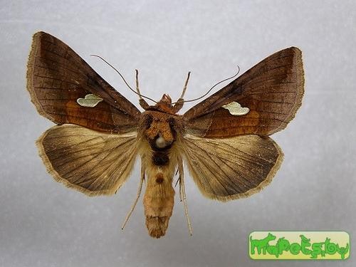 Описание: Передние крылья буро-серые с большими ромбовидными золотистыми пятнами. Задние крылья серовато-коричневые.