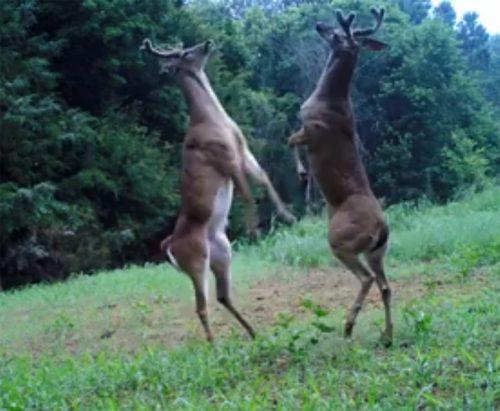 Героями видео, снятого в одном из лесов штата Теннесси, стали выясняющие отношения олени. Свои передние ноги они освободили для того, чтобы наносить друг другу удары. Съемка велась автоматической камерой, и окончание битвы в ее объектив не попало: один из оленей отступил, а другой, все так же прыгая на задних ногах, устремился вдогонку.