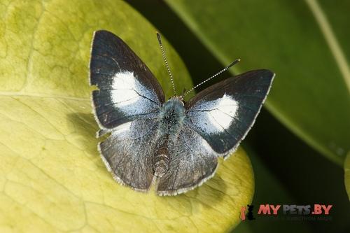 Описание: Взрослые самцы серо-синего цвета, а самки коричневая сверху с большим белым пятном на каждом крыле, и фиолетовый блеск рядом с петлями. В нижней части обоих полов белое с рядами палевый CARETS.