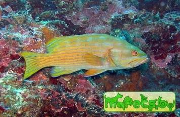 Окраска неяркая, но довольно привлекательная. Основной тон зеленовато- или золотисто-желтый, более яркий в задней части тела. На боках продольные волнистые сиреневые полоски, тянущиеся от кончика морды до хвоста. На спинной стороне и непарных плавниках полосы могут распадаться на отдельные вытянутые пятна.