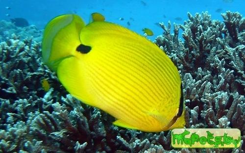 Средних размеров бабочка с вытянутым овальным туловищем. Тело и все плавники окрашены в насыщенно-желтый цвет. На боку проступает узор из тонких темных продольных полос, иногда вблизи основания спинного плавника заметны короткие продольные ряды синих точек. Через глаз проходит вертикальная черная полоса с неоново-голубой каймой. На хвостовом стебле, ближе к его верхнему краю, расположено небольшое округлое черное пятно.