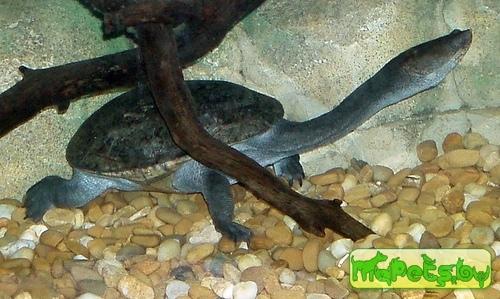 Описание: Длина овального удлиненного карапакса до 27 см. У черепах уникальный рисунок на голове в виде черно-белых полосок и пятен, напоминающих мраморные прожилки. Карапакс варьируется по цвету от коричневого до темно-коричневого с желтым сетчатым узором у некоторых особей. пластрон кремово-желтый. Шея длинная и толстая, 75% длины карапакса. Верхняя часть шеи и конечностей серая, нижняя – от белого до розового.