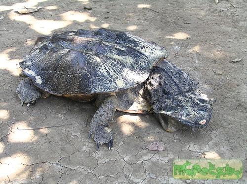 Описание: Панцирь ее зазубрен по краям, а сверху имеет три зубчатых киля, образованных острыми конусовидными буграми на каждом щитке. Панцирь длиной до 46 см. Голова и длинная шея черепахи увешанны рядами фестончатых кожистых лоскутов. Треугольная голова уплощена, на конце морды острый хоботок, маленькие глазки выдвинуты вперед, разрез рта доходит до самых ушей. Над ушами крупные кожистые выросты. Мелкие резные лоскуты висят на горле и подбородке. Цвет карапакса разных оттенков коричневого цвета, цвет кожи – от коричневого до серого. Самцы имеют более длинные хвосты, чем самки и вогнутый пластрон.