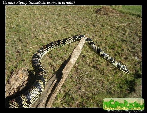Описание: Отличается от близкого вида Chrysopelea paradisi более крупными размерами и килеватыми чешуями на спине и боках. Основной тон окраски зелёный, но края спинных чешуй и кожа между ними черная. Брюхо и губные щитки светло-жёлтые. На голове присутствует рисунок из черных и светлых полос и пятен. Иногда полоски жёлтые, иногда даже оранжевые, как у Chrysopelea paradisi.