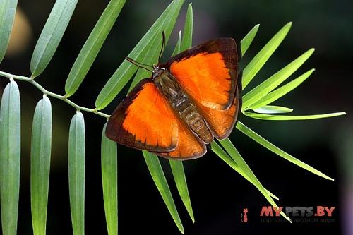 Описание: Мужской: Верхняя сторона медистых темные красные, глянцевые и блестящие. Переднее крыло: база irrorated с темными масштабах; Коста окаймлены узкой, внутренне зубчатые, черные как смоль группа, которая расширяется к вершине, и оттуда продолжали вдоль Термен , уменьшаясь по ширине от торнуса ; напротив вершины внутреннему краю черной остро угловыми. Заднее крыло: основание и спинку широко, но немного irrorated с темными масштабах; Коста узко, верхний край более широкое бледное; Термена очень узко и равномерно маржи с черным.