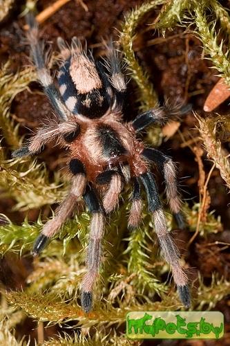 Окрас: Один из самых маленьких пауков-птицеедов, но при этом удивительно красивый и очень редкий. В России практически не встречаются.