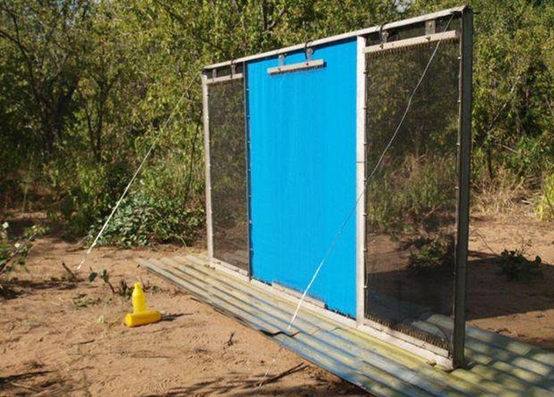 Затем исследователи начали подсчитывать эффективность ловушек. Каждую из них они устроили следующим образом: в центре была натянута ткань, сбоку на нее был направлен пульверизатор с аттрактантом, поверх нее шли тонкие провода под напряжением, а под ней — липкая пластина для сбора жертв. Привлеченные мухи садились на ткань, получали смертельный удар током, падали вниз и прилипали к поддону, где их потом было легко подсчитать.