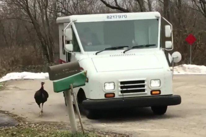 В Департаменте природных ресурсов штата заявили, что, скорее всего, фургон почтальона преследует индюк-самец, у которого идет брачный период. В такое время птицы становятся агрессивными и пытаются защитить территорию.