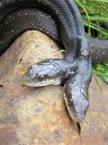 Змеи рождаются с двумя головами, когда одна оплодотворенная яйцеклетка начинает делиться в близнецов, но они не полностью разделяются. Как рассказал натуралист Алекс Холмс, двухголовую змею сложно содержать в неволе, а рождаются у серых лазающих полозов такие особи одна на 100 000 яиц.