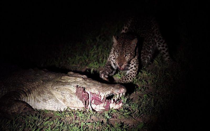 Рейнджер Николь Дангур (Nicole Dangoor,) работающая в парке Южная Луангва (South Luangwa National Park) в Замбии, поделилась удивительным наблюдением из жизни его обитателей. Ведя туристов по парку в вечернее время, она обратила их внимание на пару крокодилов, которые недавно поймали какое-то животное и наслаждались трапезой. Но сцена оказалась значительно интереснее: на запах свежего мяса пришел леопард и без особого труда отобрал у рептилии часть добычи.