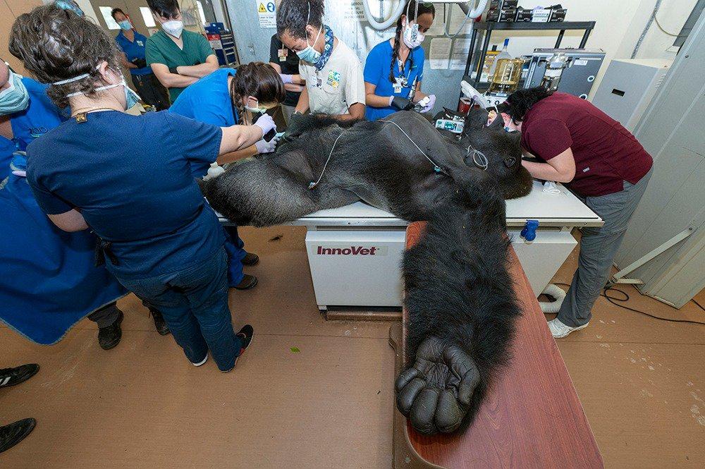 В дополнение к этим процедурам Барни получил вакцины от бешенства и столбняка. А поскольку «пациент» уже накануне встречи с врачами кашлял, специалисты уделили особое внимание его респираторной системе. Пульмонолог провел горилле бронхоскопию и собрал посевы. Результаты подтвердили опасения: у Барни начало развиваться воспаление легких.
