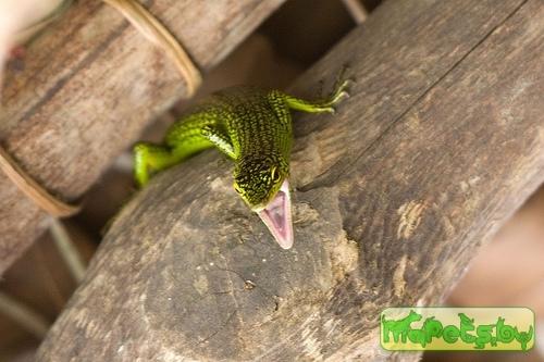 Содержание: Содержание изумрудных или смарагдовых сцинков довольно нехарактерно для представителей этого семейства. Им необходим очень высокий, не меньше метра, а желательно и выше террариум вертикального типа. На дне необходимо разместить толстый слой грунта, имитирующего лесную подстилку. Это может быть почва, кокосовая крошка, дроблёная кора. В террариуме располагаю множество вертикальных ветвей, которые могут легко выдержать вес животного. Желательно рельефно задекорировать и стенки террариума, что позволит сцинкам также использовать их для лазания. В качестве убежищ можно использовать подходящие по размеру вертикальные трубки из коры или плотного картона. Необходимо 1 – 2 раза в день опрыскивать террариум (влажность от 70 до 100%). Поилку желательно установить довольно высоко, закрепив на ветвях. Температура воздуха около 32-34 градусов, почвы 21-23.