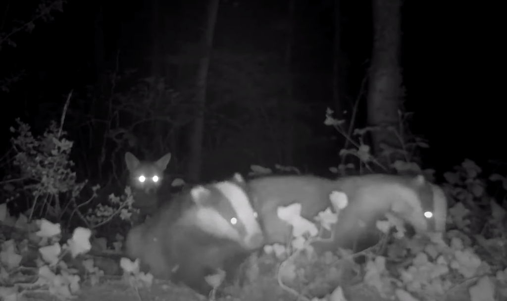 .. И еще несколько сцен из общения барсуков с лисами. Родни Холбрук, фотограф и любитель дикой природы, установил скрытую камеру в лесу неподалеку от своего дома на пляже Северн, Бристоль. Он получил необычную съёмку: два барсука дерутся друг с другом прямо перед объективом, пока на заднем плане из кустов за ними наблюдает лиса, блестя глазами.