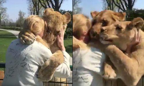 Львы бросились обнимать первую хозяйку, которую не видели семь лет