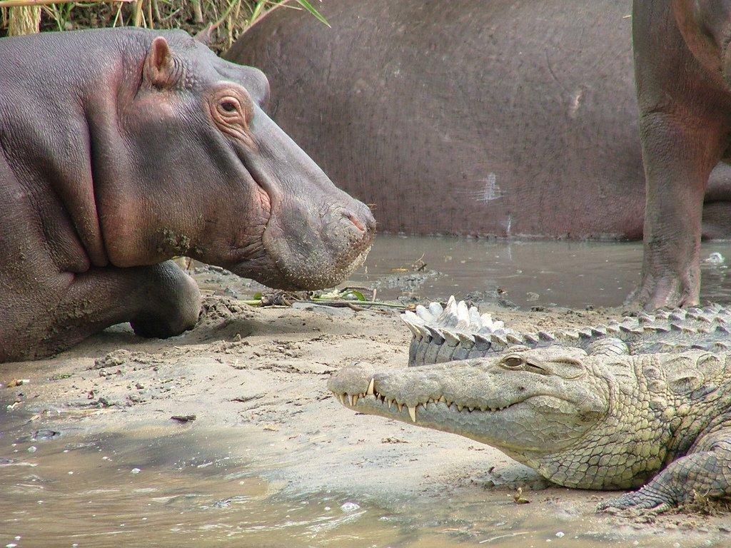Увидев плывущего у самой поверхности крокодила, молодой бегемот поспешил к нему. Хищник предпочел ретироваться на берег, но игривый подросток следовал за ним по пятам, не замечая вполне прозрачных намеков рептилии оставить ее в покое. Не известно, сколько крокодилу пришлось бы терпеть навязчивого соседа, но, к счастью, на водопой пришли слоны – и бегемоты поспешили уступить им место у воды.