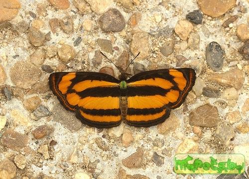 Влажная форма сезона: И мужчина и женщина имеют верхнию часть черный с оранжевыми маркировками. Переднее крыло: дискообразный подряд широкая, спереди два раза отступом, на вершине в расширении базы промежутке 3, задний дискальной коалесцент пятна, образуя нерегулярные косые короткие широкая полоса, передние места также коалесцент, косые от Коста ; postdiscal неясные серые вогнутым поперечной линии, и очень стройная, также неясным, оранжевый субтерминальный поперечной линии. Заднее крыло: расположенный под основанием или базальной мембраной поперечная широкая полоса, и гораздо более узкий диапазон postdiscal изогнут внутрь на концах, а за этим черным маржи терминал пройденный темнее черного субтерминальный линии. Нижняя каштановые, покрыты короткой, стройная, коричневые поперечные стрии на полях оранжевого цвета, которые похожи на те, на upperside но широкой, бледнее и менее четко определены. Переднее крыло: бледные поперечные postdiscal и оранжевыми линиями субтерминальный upperside заменены postdiscal lilacine узкой полосе, определяется несколько crenulate каштановыми линий на каждой стороне, и бледно субтерминальный линии. Заднее крыло: база проникнута lilacine; расположенный под основанием или базальной мембраной и postdiscal полосы граничит внешне узкими полосами lilacine, оранжево-желтые postdiscal группы затемнено на поперечных коричневых рознь; терминал маржу с извилистыми неясным широкая линия lilacine. Антенны, голову, грудь и брюшко черные, под ним, щупики и грудной клетки сероватого, живота ochraceous.