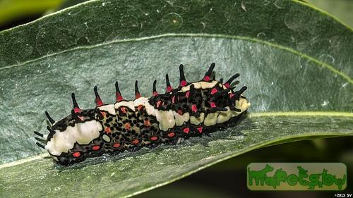 Взрослые личинки: коричневый с двумя субдорзальных и двух боковых рядов мясистыми заостренными бугорками, каждый из которых красное пятно на его базе, передние, средние и задние боковые участки скучно ochraceous, две последние встречи на спинке, а остальные хотя Личинка с пятнами черного и красного.