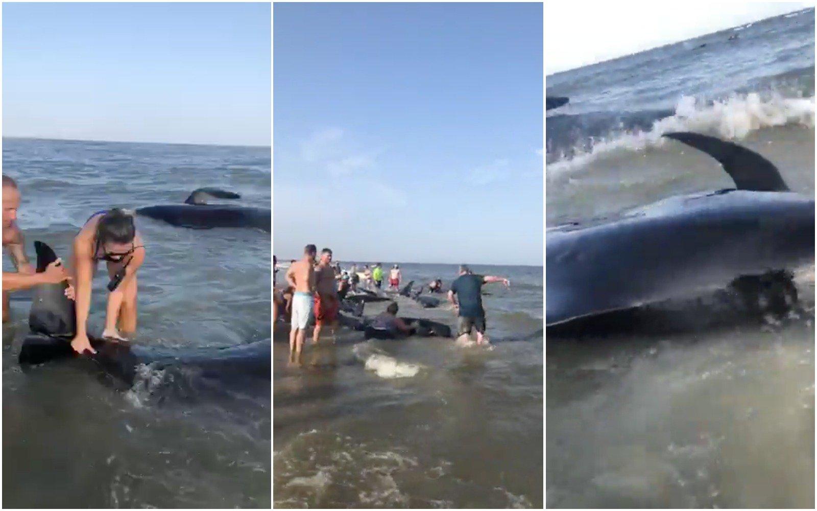 16 июля на одном из пляжей США обнаружили десятки гринд. Люди ринулись на помощь. Порой на побережьях замечают выбросившихся китов и дельфинов. Причина такого поведения зверей не вполне установлена.
