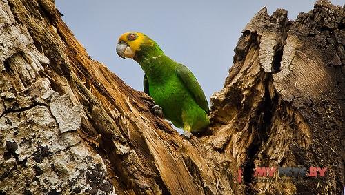 Окраска зеленая. Щеки и лоб желтые. Брюшная часть тела светло-зеленая с голубоватым оттенком, такого же цвета и надхвостье. Рулевые перья оливково-бурого цвета, хвост оливково-коричневый. Окаймление рулевых и хвостовых перьев зеленое.