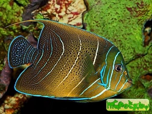 Средних размеров ангел, имеет ярко-синюю кайму по краям жаберной крышки и плавников. Тело коричневато-зеленое, покрытое многочисленными пятнышками, которые темнее основного тона в передней части и светлее в задней. Молодые черные или тёмно-синие, с рисунком из дугообразно-изогнутых чередующихся голубых и белых тонких линий. С возрастом количество линий увеличивается, они становятся более тонкими и частыми. При длине тела около 10 сантиметров окраска начинает меняться, линии постепенно исчезают, уступая место зеленоватому фону с мелкой «рябью». Одновременно появляется характерная ярко-синяя кайма. Половой диморфизм не выражен.