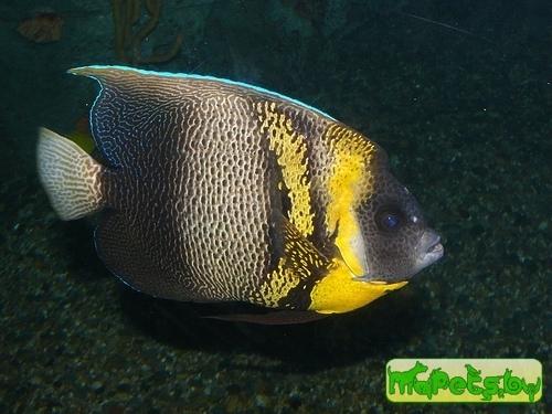 Очень крупный ангел, с массивным овальным телом, окружённым широкими треугольными спинным и анальным плавниками, которые придают ему дискообразную форму. Вершина спинного плавника у взрослых рыб вытянута в длинную косицу. Взрослые тёмно-серые, задняя часть головы и грудь с широкими вертикальными дугообразно изогнутыми жёлтыми полосами. Молодые черные или тёмно-синие, с рисунком из дугообразно-изогнутых широких жёлтых полос, между которыми располагается по несколько ярко-синих тонких линий. С возрастом полоски становятся тоньше, бледнее и постепенно исчезают. Половой диморфизм не выражен.