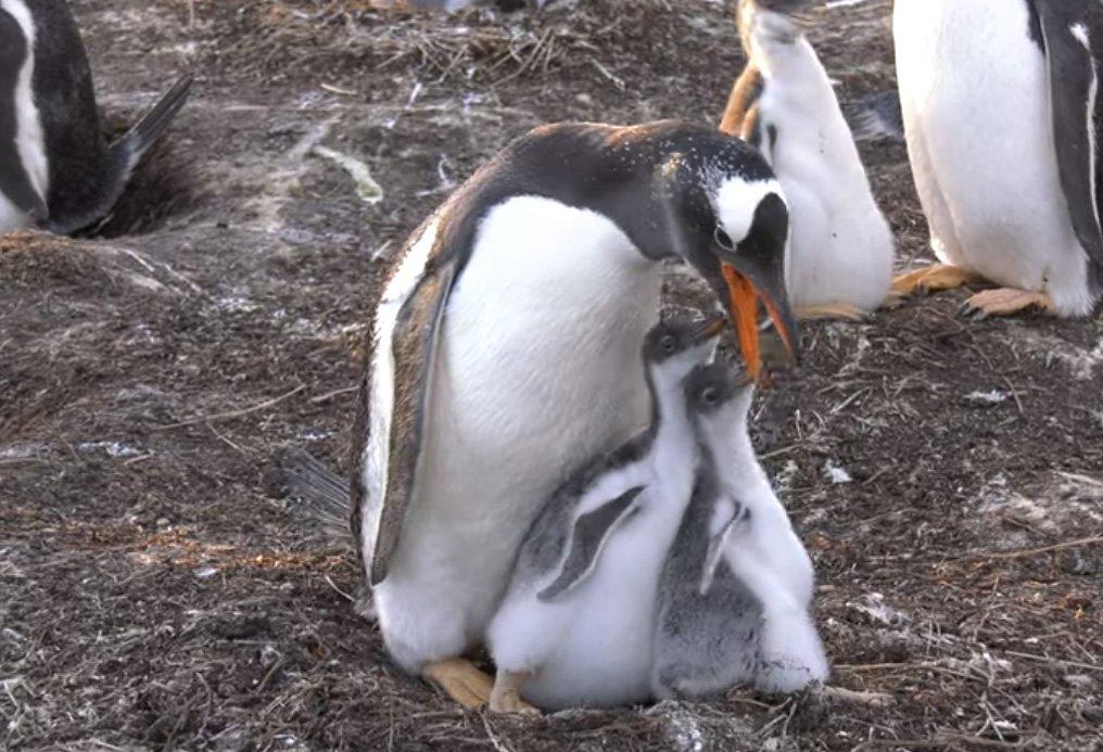 Кормление детенышей у пингвинов происходит следующим образом: взрослая особь извергает из клюва полупереваренную и обработанную ферментами кашицу. Судя по видео, которое недавно опубликовал фонд защиты пингвинов, один птенец заметно крупнее другого — вероятно, он первым успевает получить максимум пищи, а его брату или сестре достается меньшая часть.
