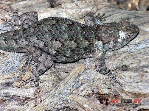 Заборная игуана или как ее еще называют колючая игуана(Sceloporus clarki). Это самый распространенный вид игуан, населяют эти зверки территорию от Панамы до Канады. У них между горлом и брюхом присутствуют характерные пятна, цвет пятен может отличаться, это зависит от среды обитания. Чаще всего встречаются пятна именно на горле и брюшке, от ярко – синего до темновато–синего, больше похожего на черный цвет. При встрече с соперником или в период брачного периода, когда выделяется тестостерон, цвет пятен может приобретать светловатый оттенок.