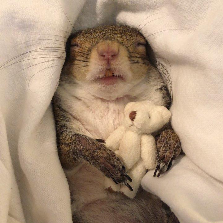 У белки есть собственный плюшевый мишка, составляющий ей компанию во время отхода ко сну.