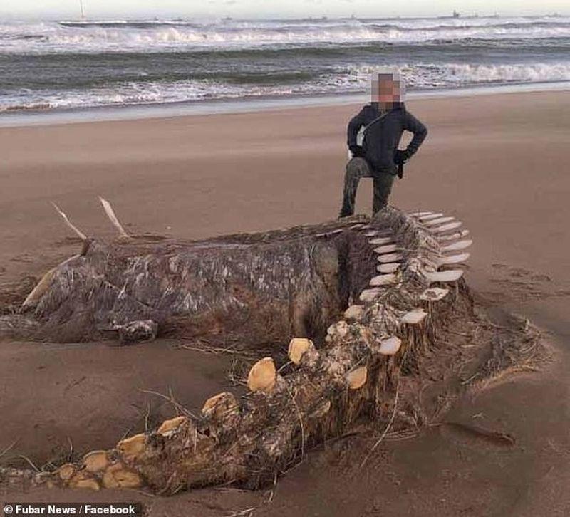 Интригующее существо обнаружили в воскресенье, 9 февраля. Это произошло после того, как в регионе прошли сильные ветра и проливной дождь. Фотографию скелета опубликовали в Facebook. Комментаторы предположили, что останки могут принадлежать киту или дельфину, при этом у существа имеются рога. Некоторые не исключили, что это скелет лохнесского чудовища.