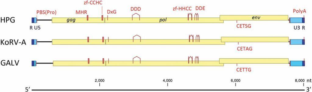 Геном HPG имеет высокую степень подобия с ретровирусом коал (KoRV-A) и вирусом лейкемии гиббонов (GALV) / © Tachedjian, Hayward et al., Proceedings of the National Academy of Sciences, 2020