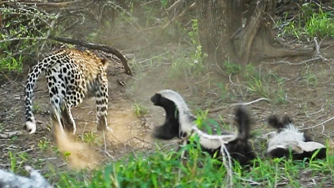 Тем не менее, высшие хищники не оставляют попыток отведать мясо медоеда. У взрослой особи есть одно слабое место – более тонкая кожа на животе, а детеныши уязвимы почти целиком. Сцену нападения леопарда на юного медоеда сняла 28-летняя Сахара Вулфсон (Sahara Wulfsohn), работающая в парке гидом. По ее словам, неподалеку от лоджа, где отдыхали туристы, был замечен леопард, и девушка расположилась на террасе с видеокамерой. Зрелище, представшее перед ее глазами, превзошло все ожидания: кошка осторожно подкрадывалась к своей жертве, которой оказался детёныш зверька из семейства куньих. Затем леопард подобрался к маленькому медоеду вплотную и вскоре набросился на него.