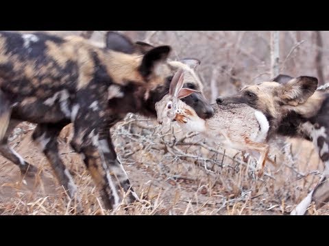 Стая, состоящая из 4 взрослых и 8 щенков гиеновидных собак, некоторое время резвилась, а затем родители отправились на охоту. Вскоре они заметили кустарникового зайца и устремились за ним, терпеливо преследуя на протяжении полукилометра. Жизнь жертвы висела на волоске, и люди с замиранием сердца наблюдали за развитием событий. Итог был предрешен: попытка скрыться в норе трубкозуба кролику не удалась, и голодные звери в считанные секунды растерзали его. На видео запечатлен момент, как несколько гиеновидных собак с легкостью раздирают тушку зайца, демонстрируя силу своей хватки.